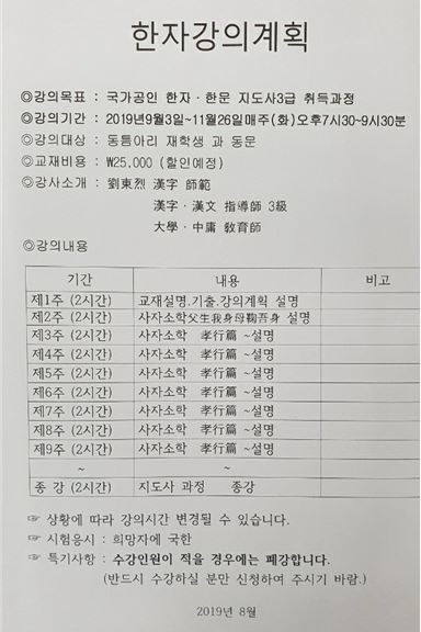 작년에는 아동한자지도사 자격증이었는데요, 올해는 "한자한문 지도사3급" 자격증을 목표로 강의하신다고 하시네요.