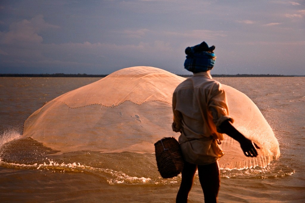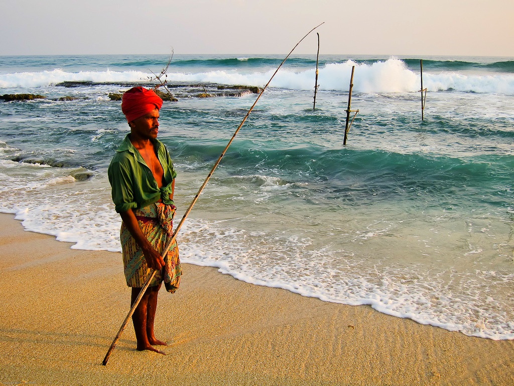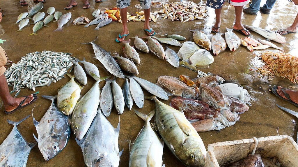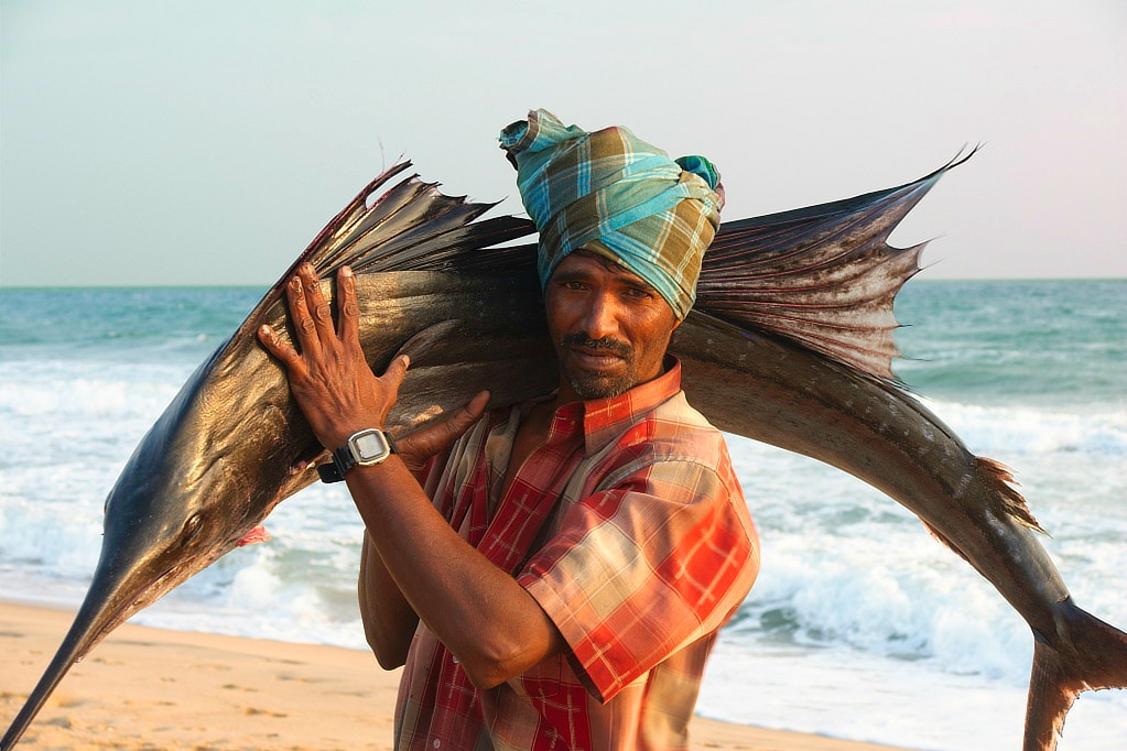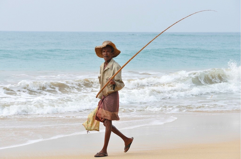낙시어부가 열대어 "니모" 라는 큰고기를 잡아서 어께에 메고간다