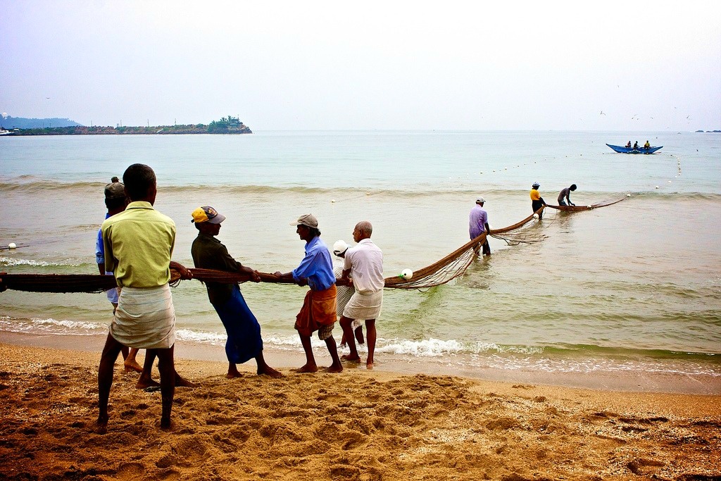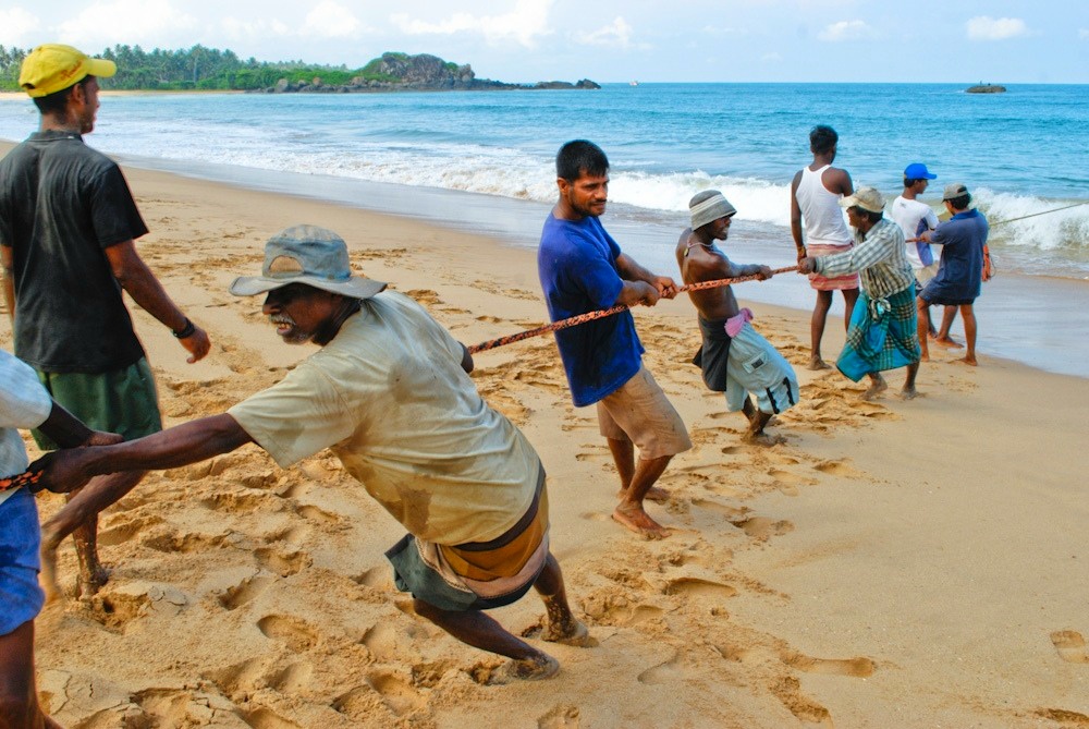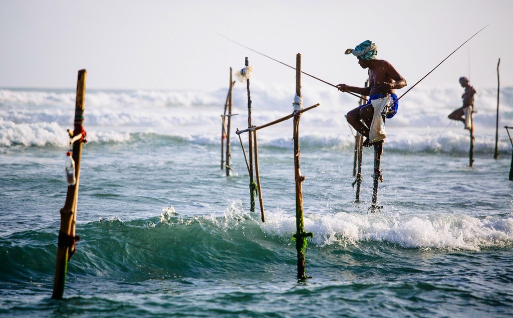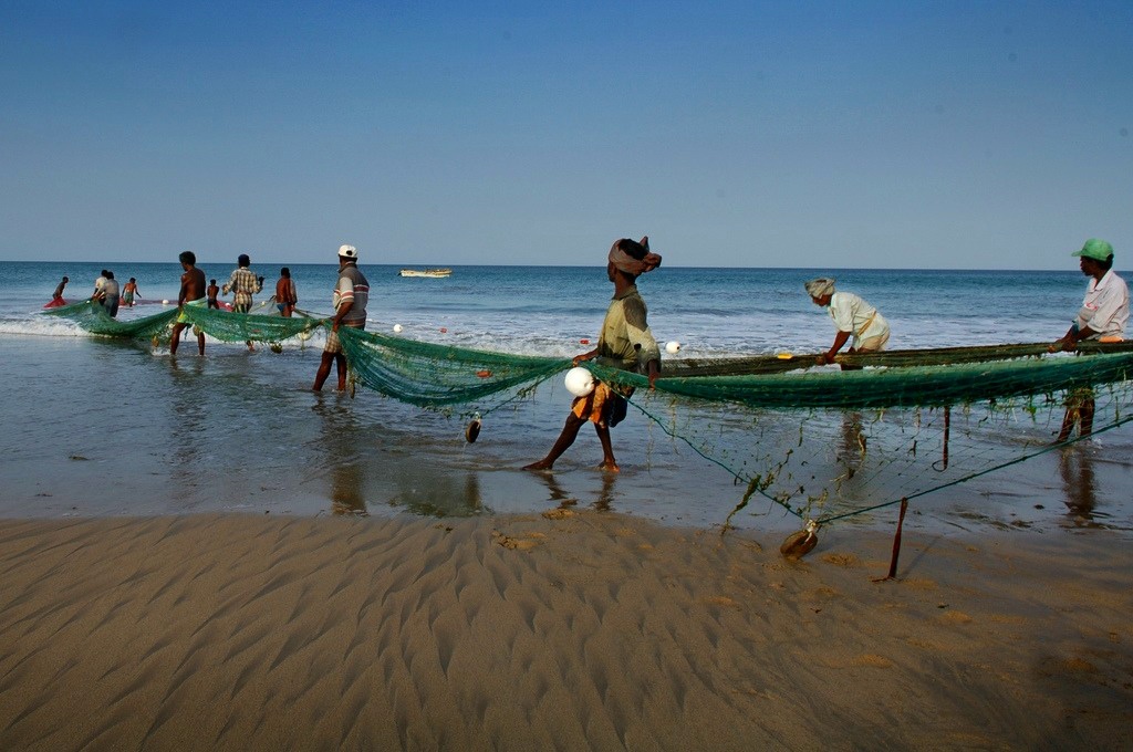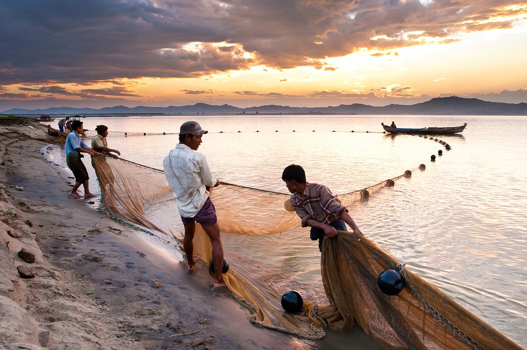 낙시어부가 열대어 "니모" 라는 큰고기를 잡아서 어께에 메고간다