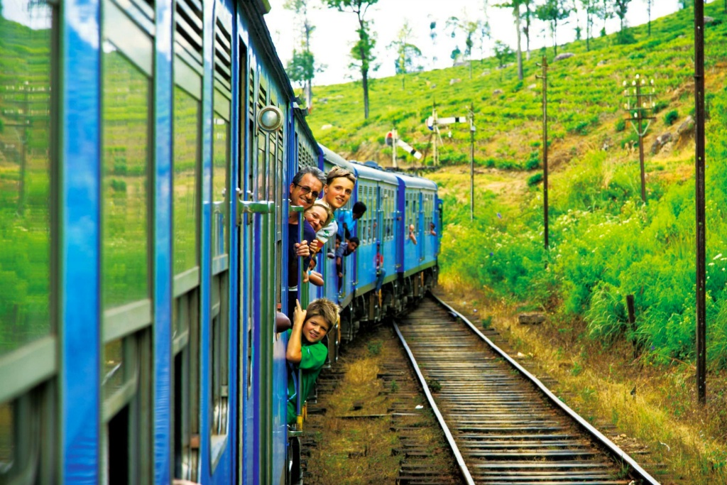 관광객은 밝은웃음로 달리는 기관차에서 관광하고있다