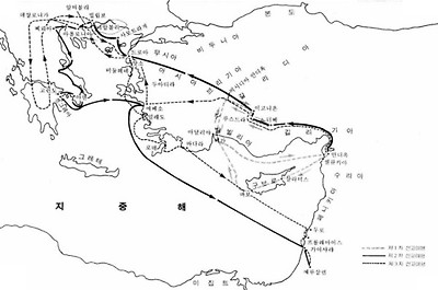 굵은 점선: 바울의 3차 교회 설립 여행. 시리아의 안디옥에서