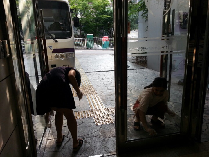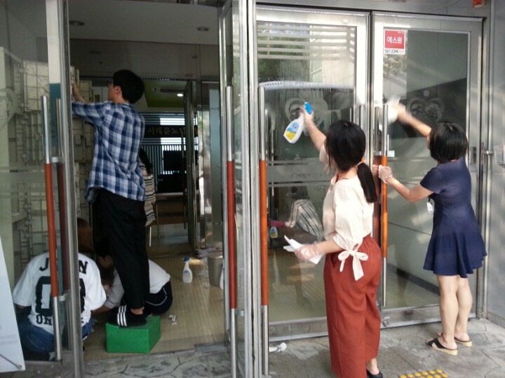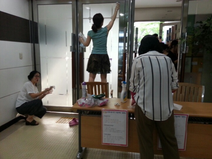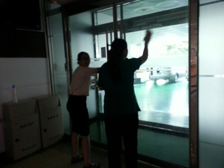 깜짝 놀란것은 복지2팀 부장님을 비롯해 복지1팀의 이수진과장님과 함께 정문 후문 유리문과 사물함을 청소하는 복지사님들을 보았다.