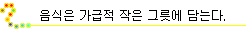 | 작은 그릇에 음식을 가득 담아 먹으면 적은 양을 먹어도 포만감을 느끼게 된다. 시각적인 착각 때문에 그릇은 비록 작지만 음식이 가득 담겨 있기 때문에 상대적으로 많이 먹는 것처럼 느끼게 된다. 특히, 우리 나라 사람들은 음식을 남기지 않은 습관이 있으므로 이런 요령이 더욱 필요하다. |