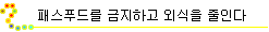 | 패스트푸드란 고지방, 고당, 고염분의 식품으로 칼로리가 매우 높다. 따라서 이를 많이 먹으면 살이 찌는 것은 당연한 일, 전문가들에 의하면 외식을 자주 하는 사람들이 그렇지 않은 사람들보다 더 많은 지방과 칼로리를 섭취한다고 한다. 이제부터는 가능하면 패스트푸드나 외식을 줄이고 직접 만든 음식을 싸가지고 다니는 습관을 들이자. |