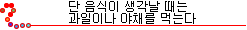 | 단 음식을 좋아하는 사람들이 살이 찌는 경향이 많다. 단 음식에 대한 욕구가 생길 때 과일이나 야채를 먹는 습관을 들이면 조금이나마 살이 더 찌는 것을 방지 할 수 있다. 또한 야채나 과일은 많이 이용할수록 좋기 때문에 손쉽게 먹을 수 있도록 미리 손질하여 준비해두는 것이 좋다. |