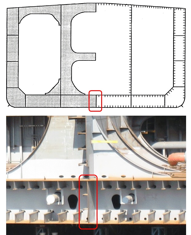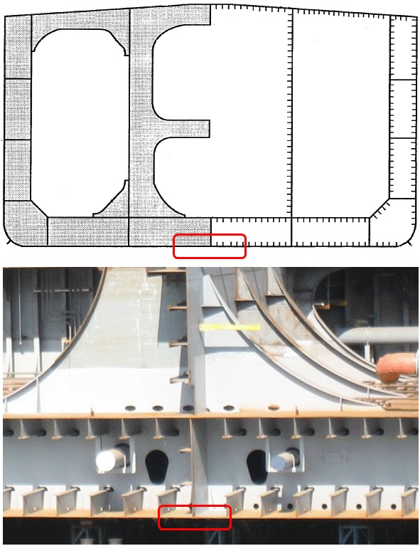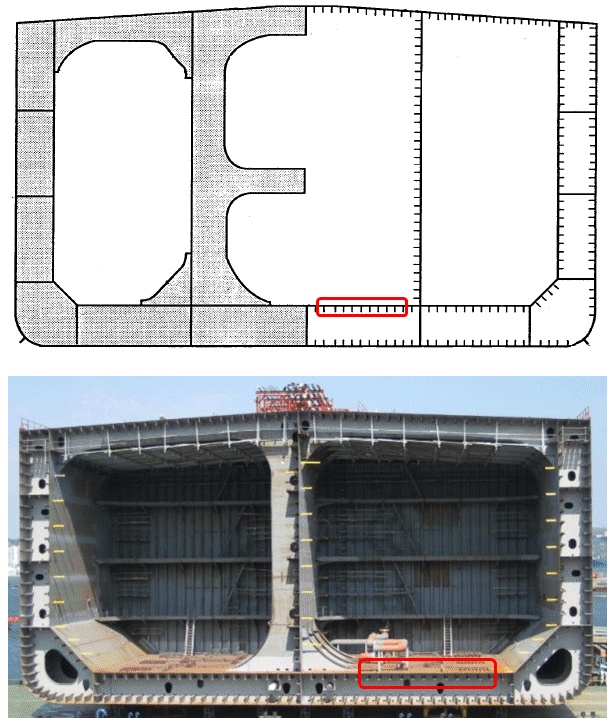 이중저(Double Bottom) 구조의 안쪽 바닥판. 즉, 이중저 탱크의 윗판 (Tank Top Plate) 이기도 하다. 위 사진은 이중저 발라스트 탱크 (Double Bottom Ballast Tank) 를 가진 탱커선의 단면이다. |