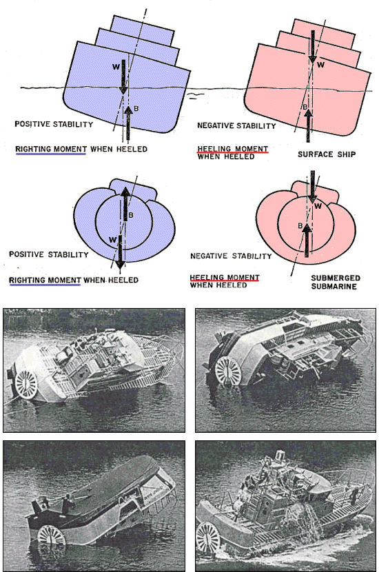 만일 배의 무게중심을 연직선에 연하여 위로 올리면, 그 배는 세로 방향으로 전복할 위험이 생기기 훨씬 전에 가로 방향으로 전복할 것이다. 손상되지 않은 배가 세로 방향으로 전복하는 일은 있을 수 없는 일이다.