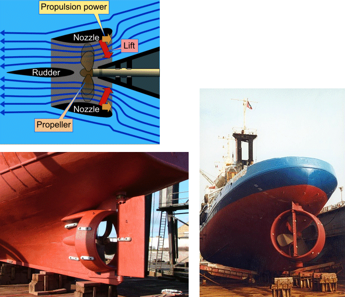 처음에는 예선과 같이 부하가 높은 프로펠러에서만 사용되었고, 그 주된 목적은 계류 상태에서 정적예인력을 증가시키는 데 있었으며 동일한 동력으로 30~40%의 예인력 증가를 얻을 수 있었다.