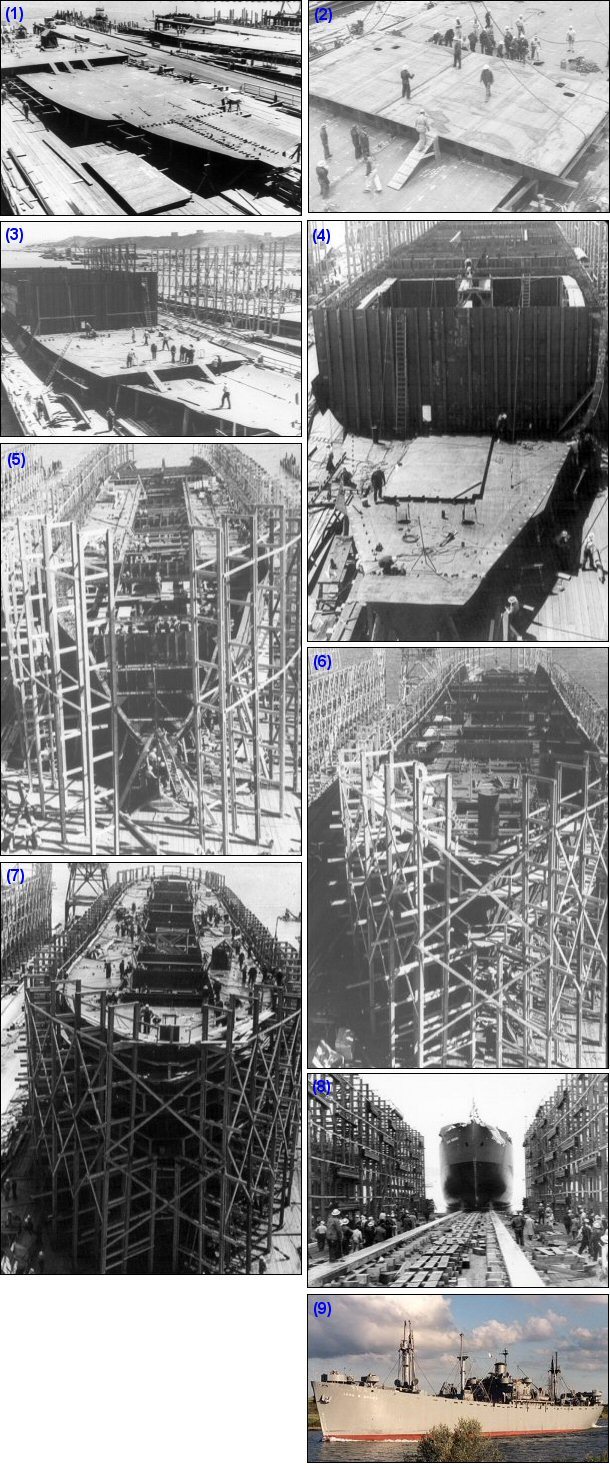 사진 1) 1941년 4월 14일, 용골판이 거치된 모습 사진 2) Midship 부위의 Inner-Bottom Tank 가 탑재되는 모습. 사진 3) 1941년 6월 19일, 격벽(Bulkhead)가 세워지는 모습. 사진 4) 1941년 6월 28일, 격벽간의 외판이 부착되는 모습. 사진 5) 1941년 7월 9일, 격벽과 외판작업이 선수쪽으로 진행된 모습. 사진 6) 1941년 7월 20일, 선수부 까지 완성된 모습. 사진 7) 1941년 8월 1일, 상갑판 작업 모습. 사진 8) 1941년 8월 16일, 진수되는 모습 사진 9) 완성된 모습 |