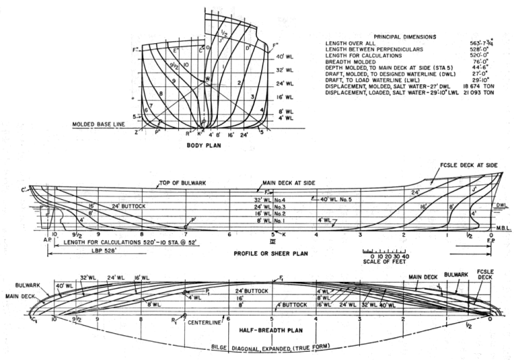 모든 배의 모양은 세로 중심면 (Longitudinal Center Plane)에 대하여 대칭이므로 보통 배의 한 쪽 모양만 그린다.