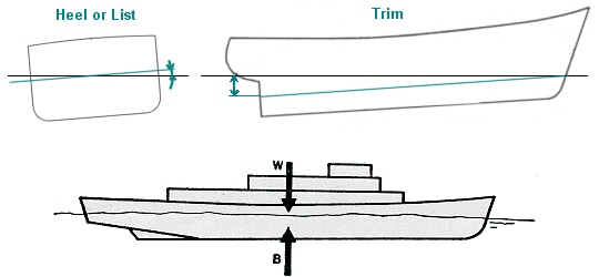 배는 어느 방향으로도 경사할 수 있다. 가로방향의 경사를 횡경사 (Heel or List) 라고 하고, 세로방향의 경사를 종경사 (Trim) 이라고 부르며, 보통 횡경사는 각도로 표시하고, 종경사는 선수 선미간의 흘수(Draft)차이로 표시한다.