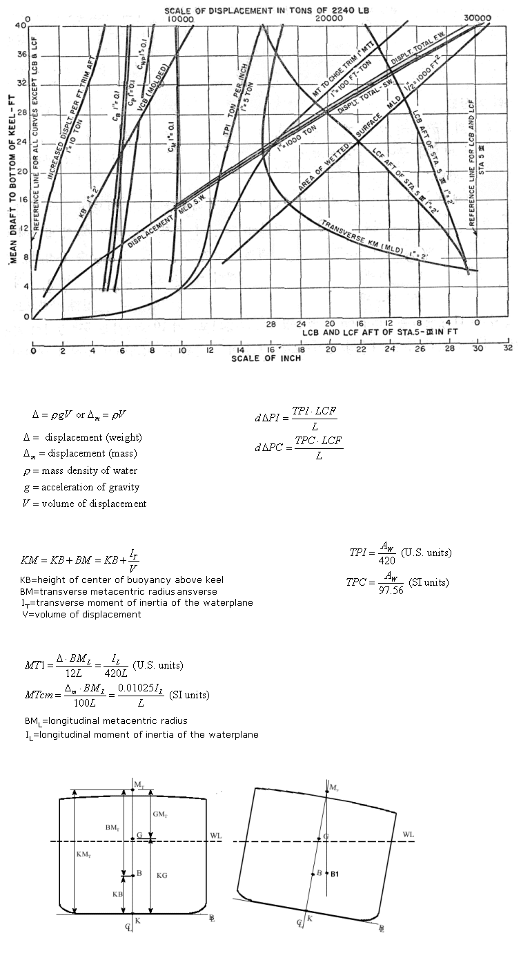 배의 운항 중에 여러 가지 다른 수선에서 배가 뜨게 될 것을 예상하여 임의로 선정된 몇 개의 평행 수선까지의 선체의 전체 배수량과 그 밖의 성질들을 미리 계산하는 것이 보통이며, 이들 데이터를 곡선으로 나타낸 도면을 '유체 정역학적 성질의 곡선' 혹은 '배수량 및 그 밖의 곡선들' 이라하며 아래와 같은 항목들을 포함하고 있다.