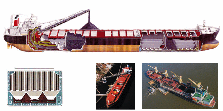 화물의 적재는 항만의 컨베어벨트를 통해서 이루어지고, 화물의 하역은 본선에 장착된 컨베어시스템을 사용하여 이루어진다. 이러한 선박의 화물창은 화물이 바닥에 설치된 배출구로 잘 흘러내리도록 깔대기식의 경사진(hopper-sloped) 형태이다. 흘러나온 화물은 화물창 아래에 설치된 컨베어벨트(Tunnel Conveyor Belt)로 떨어져서 선박의 한편으로 이송되고, 이는 다시 Loop 혹은 Inclined Conveyor Belt System 을 통해 갑판 위로 올려지며, Boom Conveyor Belt 는 이 화물을 접안지의 정해진 장소에 보내어 배출한다.