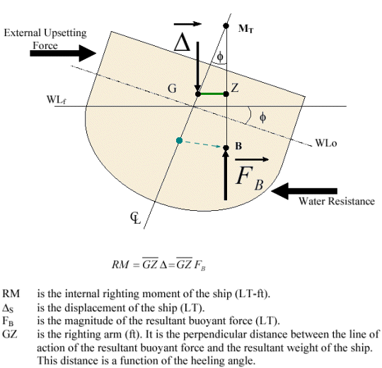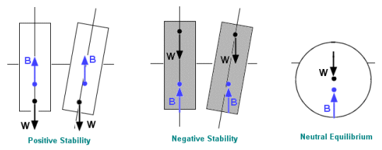 이렇게 외부의 모멘트에 의해 배가 기울어지면, 배는 자체적으로 이에 대응하는 반대 방향의 모멘트 (Internal Moment)를 발생시켜 더 이상의 기울어짐을 막는 모멘트의 평형을 이루고자 하는데, 이는 배의 중량과 부력의 작용점 위치에 좌우 된다.