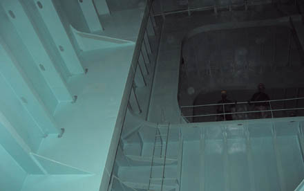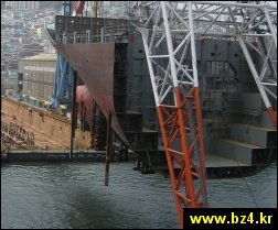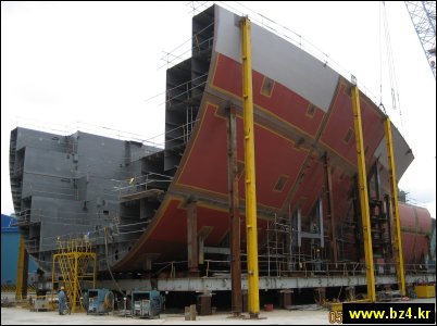 여러 개의 블록들을 탑재하여 하나의 대형 블록을 만들고 있다. 대형 P-E Block 을 해상크레인으로 운반하여 연결선을 보면 단 블록의 크기와 갯수를 알 수 있다. 드라이 도크에 넣는 모습. |
