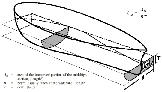 중앙 단면 계수는 특정 흘수에서 중앙 횡단면의 수선 아랫부분의 면적과 그 부분에 외접하는 직사각형의 면적과의 비 이다. 보통 선형의 배에서는 0.75 ~ 0.98 의 범위 안에 있으나, 극히 날카로운 선형의 배애서는 0.67 까지 내려가는 경우도 있다. 어떤 배에서는 수선 아래 쪽에 불룩 튀어 나온 부분이 있어 최대 폭이 수선의 폭을 넘게 되므로 값이 1 보다 커지는 경우도 있다. |