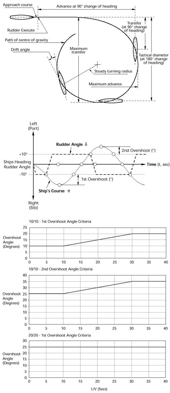 IMO Criteria 는 위 도표와 같이 10/10 Zig-Zg Test 는 첫 번째와 두 번째 Overshoot 의 허용치를 규정하며, 20/20 Zig-Zag Test 에서는 첫 번째 Overshoot 의 허용치만을 규정하고 있다.