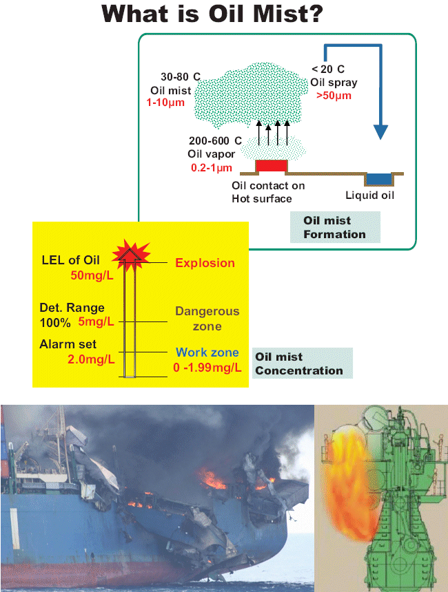 유증기(Oil Mist)가 엔진의 크랭크실과 기어케이스의 폭발의 원인이 된다는 것은 잘 알려진 사실이다. 이는 뜨거운 표면과 오일의 접촉에서 발생하는 유증기 방울의 농도가 인화한계점(약50 mg/l)을 초과할 수 있기 때문이다.