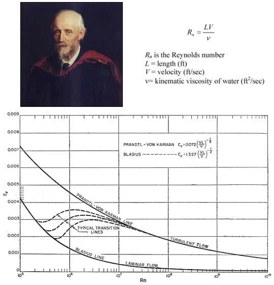 영국의 Osborne Reynolds 는 유리관을 통하여 물을 흐르게 하는 실험으로 어떤 속도 이하에서는 흐름에 대한 관의 저항이 속도에 비례하였지만, 높은 속도에서는 그 저항이 속도의 제곱보다 다소 낮은 비율로 증가하는 것을 알아내었다. 즉, 서로 다른 저항 법칙에 따르는 두 가지 형식의 흐름이 존재한다는 것이다. 그의 발견은 위 공식과 같이 정리되었고, Reynolds Number (Rn) 로 불리게 되었다. 위 사진은 Osborne Reynolds (1842~1912).