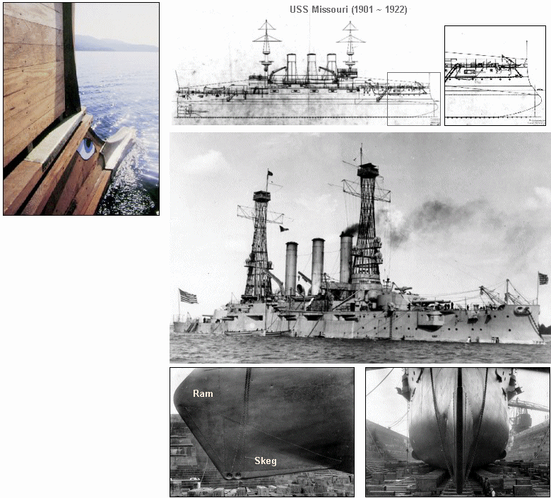 아래는 충각 선수를 적용한 거의 마지막 세대인 미국 해군의 전함 Missouri 호의 사진이다. Ram 하부에 Skeg 를 추가로 부착하였지만 정면의 모습을 보면 구상 선수와는 달리 날카로운 모양이다. |