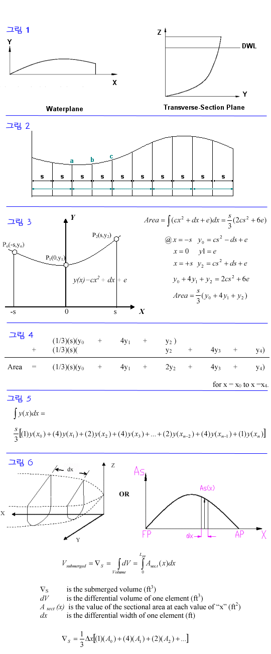 선체의 곡선은 일정한 함수로 나타내지는 것이 아니므로 이러한 단면의 면적을 계산하는 데는 특별히 고안된 방법들이 사용되고 있는데 그들 중에서 흔히 사용되는 Simpson 의 제1법칙을 간략히 소개하기로 한다.
