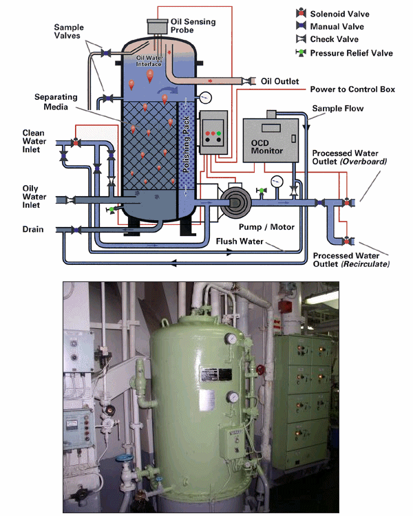 선내에서 발생하는 기름섞인 물 (Oily Water)에서 기름을 분리하여 깨끗한 물만 선외로 배출할 수 있게하는 장치이다. 해상오염방지조약(MARPOL)에 의거 기름성분이 15 PPM 이하인 물만 선외배출 가능하므로, 유수분리기는 기준치 이하로 유성분을 분리해야하고 15 PPM 이상이 되었을 경우에는 경보를 발생하는 동시에 자동적으로 선외배출을 차단하는 장치를 장착하고 있다. 위 그림은 기름과 물의 비중차를 이용해 분리시키는 장치의 사례이며, 사진은 선내 기관실에 설치된 유수분리기의 모습이다. |