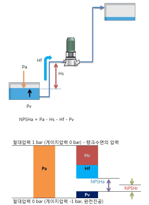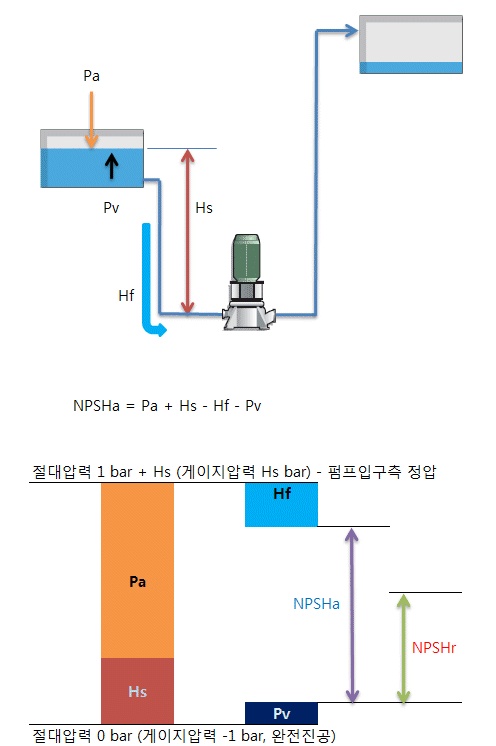 NPSHa (Available NPSH) - 유효흡입수두, 배관시스템의 설계에 의해 결정됨 펌프의 설치 위치, 흡입관경, 흡입배관 길이, 이송액체의 종류 및 온도 등에 의하여 결정된다. 안전한 펌프 운전을 위해 필요흡입수두(NPSHr) 보다 최소한 1.2~1.3배 정도 크게 유지되도록 시스템을 구성한다.