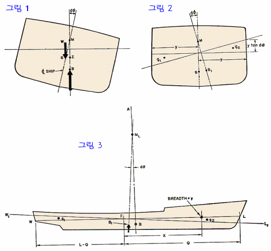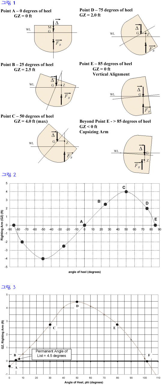 배의 중량은 무게중심(G)에서 수직 하향으로 작용하고, 배의 경사에 따른 무게 이동이 없다면, 무게중심의 위치는 변하지 않을 것이다. 반면에 부력은 부력 중심(B)에서 수직 상향으로 작용하나, 배의 경사에 따라 변동된 수면 하부 모양의 도심(Centroid)으로 부력중심의 위치가 이동 할 것이다.