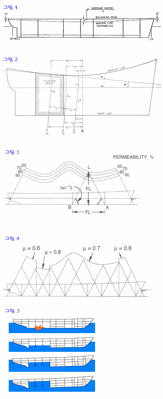 이러한 가침장 곡선을 활용하면 배의 구획을 나누는 격벽의 위치를 그림 4)와 같이 각 구획에 적용되는 침수율에 맞추어 정할 수 있다. |