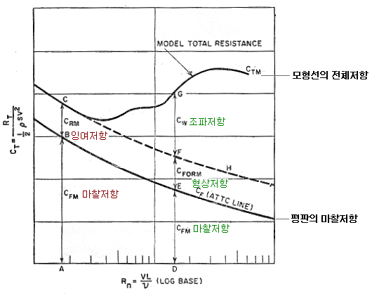 어떤 속도 범위에 걸쳐 모형선의 전체저항(RTM)을 계측한 뒤에, Reynolds Number 에 대한 계수로 나타내면 위 그림의 CTM 과 같은 일반적인 모양의 곡선을 얻게된다. 여기에 완전한 난류에서의 매끈한 평판(모형선과 같은 길이와 침수면적을 갖는)에 대한 마찰저항 계수 CF 곡선을 넣어서 비교해 보면 CRM 만큼의 차이가 있음을 알 수 있다.