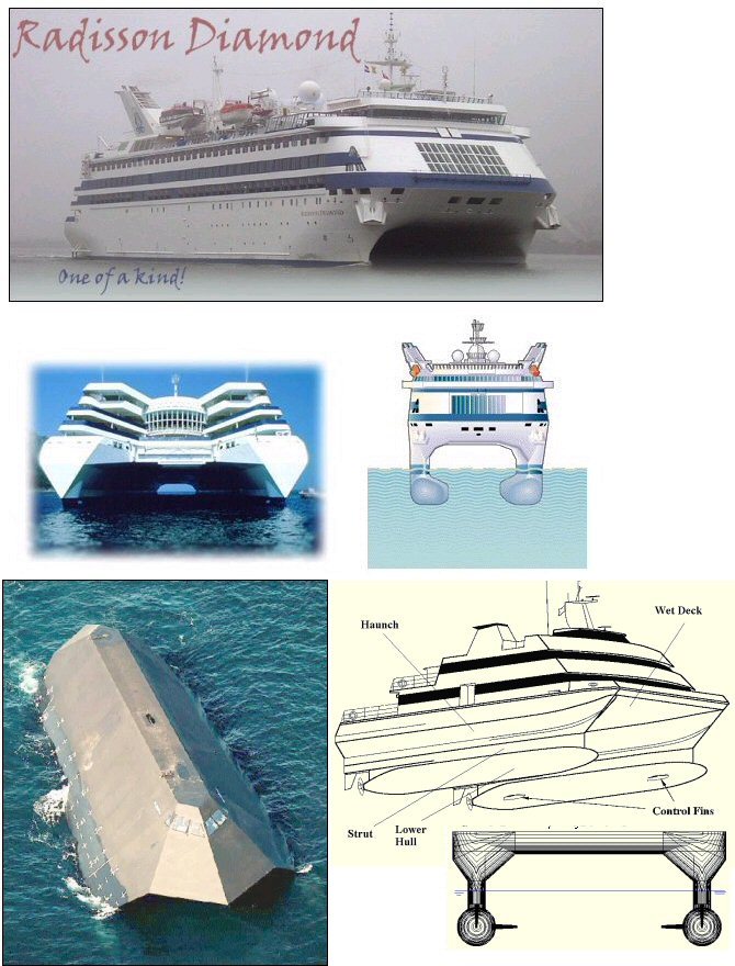 사진 위는 SWATH 선형의 유람선, 아래 좌측은 미국 해군의 스텔스(Stealth)선인 Sea Shadow 로 역시 SWATH 선형이다. |