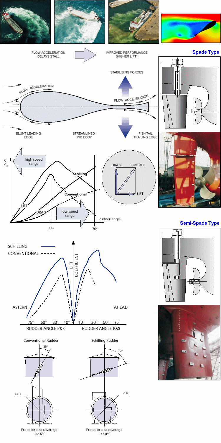 ▶ 특성 1970년대 에 내륙 수로를 운항하는 바지형 선박용으로 저속에서의 조종성능을 향상시키는 목적으로 개발되었으며, 대양선에 적용하는데 문제가 되었던 Speed/Power Performance 의 개선으로 현재는 Tug 에서부터 VLCC 까지 모든 크기의 선박에 적용이 가능하게 되었다. - 저속에서 뛰어난 조향성 - 우수한 침로유지 - 조타기 떨림감소 - 큰 사용각도 (140° = 70° Port & St'bd) - 우수한 후진 조종성