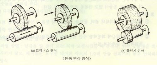 1) 연삭 방식 ; 회전하는 연삭 숫돌 바퀴가 길이 방향으로는 이송하지 않고 반지름 방향으로만 적당량의 연삭깊이로 이송하면서 제자리에서 회전만 하는 일감을 연삭하는 방식이다.