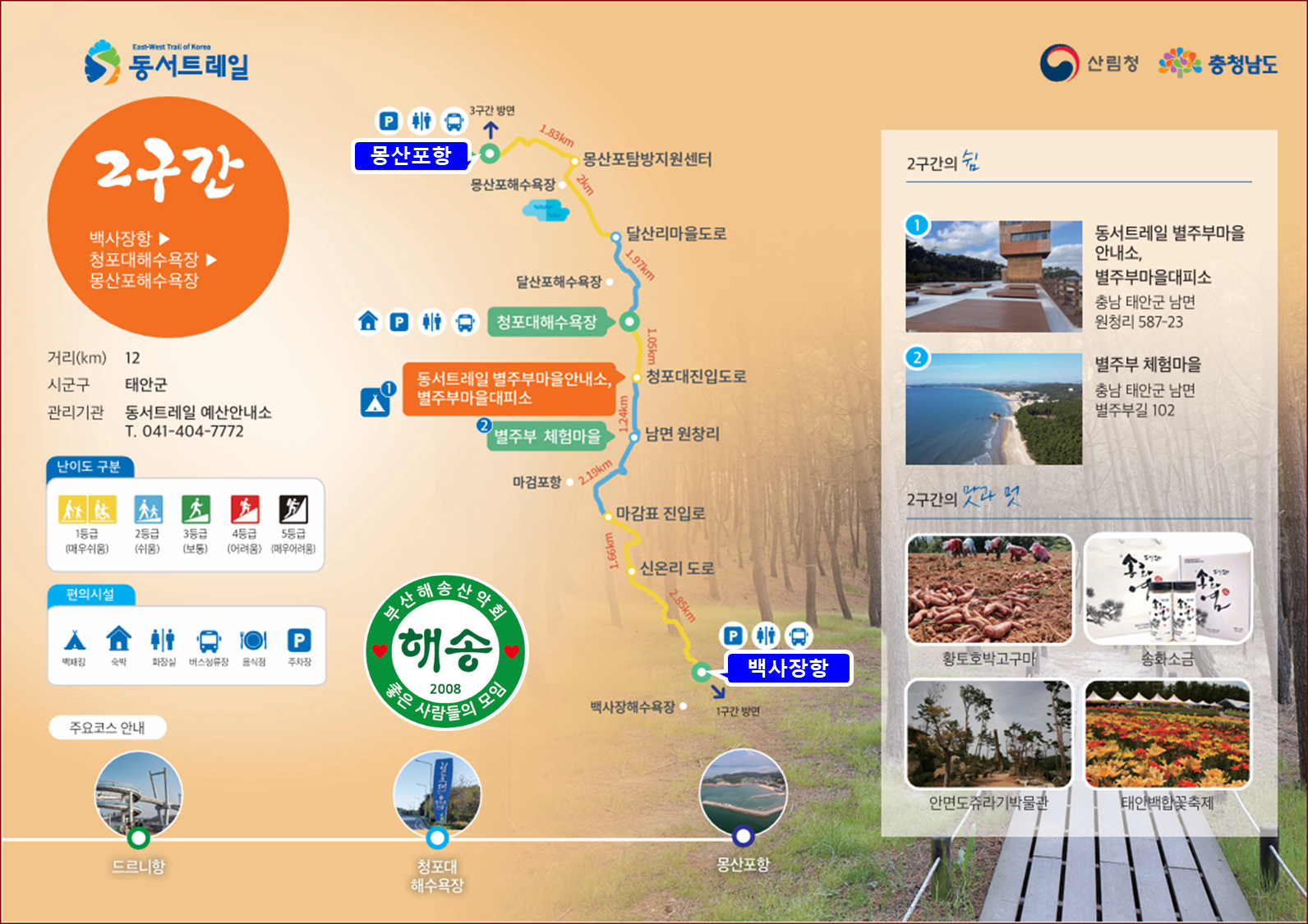 | ■ 산행 코스 | ☞2:백사장항-마검포항-별주부마을-청포대해수욕장-달산포해수욕장-몽산포항(12km, 4시간) ( 3코스 좀 걷고 싶지만 대형차량 들어갈수 없고 화장실 등 문제로 2구간만 완주) ☞귀가길 : 여유시간 있을시 간월암 또는 예당호 출렁다리 중 택1 예정 | ||