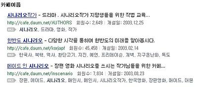 Daum 검색에서 특히 좋았던 건 검색 카테고리에 '카페이름'이 있어 시나리오 관련 카페를 알게 되어 도움이 되었던 점이었습니다.