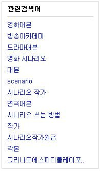 Daum에서 검색했을 때, 관련검색어(연관검색어)로 보다 많은 단어들이 뜹니다. 수적으로는 Daum이 앞서지만, 검색 사이트에 따라 검색해내는 개성이 조금 차이가 있음을 알았습니다. Daum 관련검색어들이 '시나리오'에서 파생되는 것들 쪽으로 많다면, Naver 연관검색어들은 보다 원론적인 것들이 뜨는 것을 알 수 있습니다.