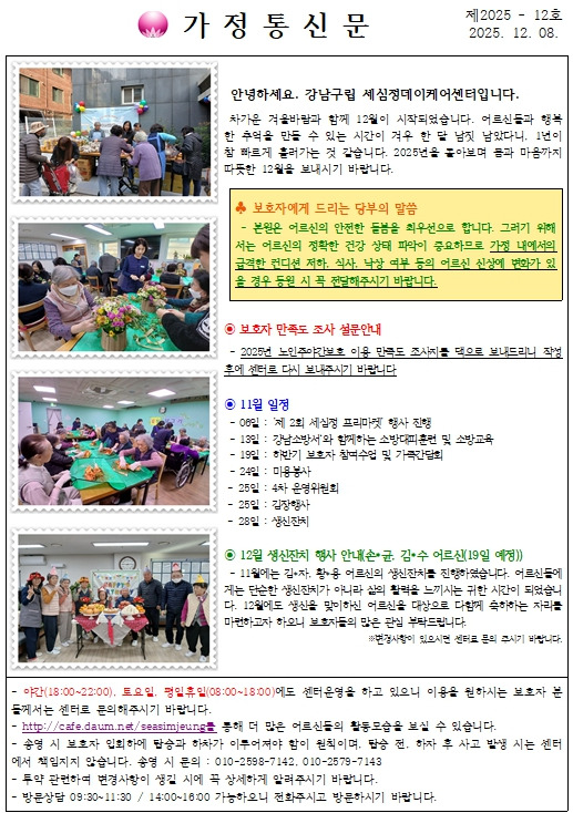 25년 12월 가정통신문 작성자세심정데이케어센터|작성시간25.12.16|조회수12 목록 댓글 0 글자크기 작게가 글자크기 크게가 다음검색 현재 게시글 추가 기능 열기 북마크 신고 센터로 신고 댓글 댓글 0 댓글쓰기 댓글 리스트