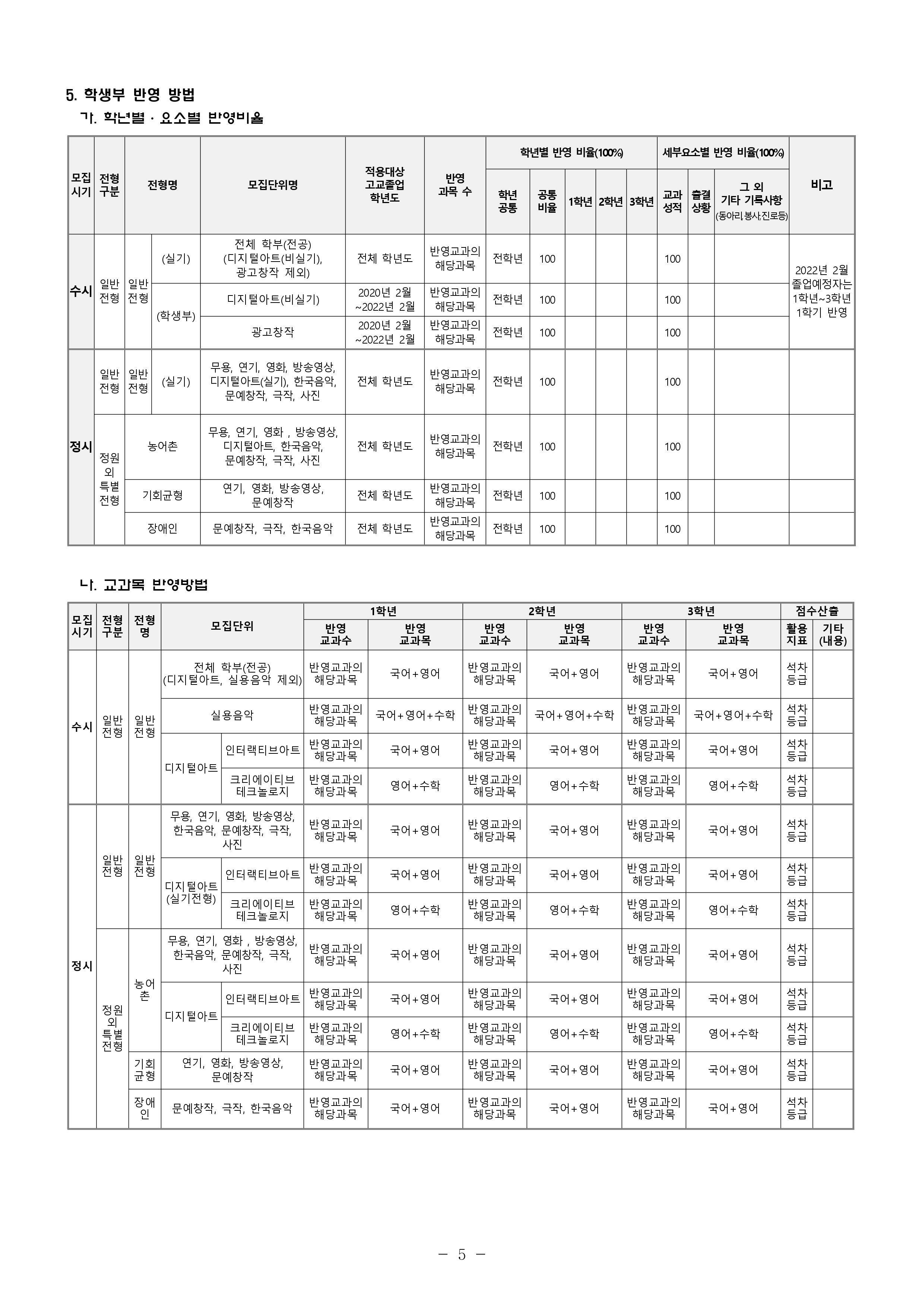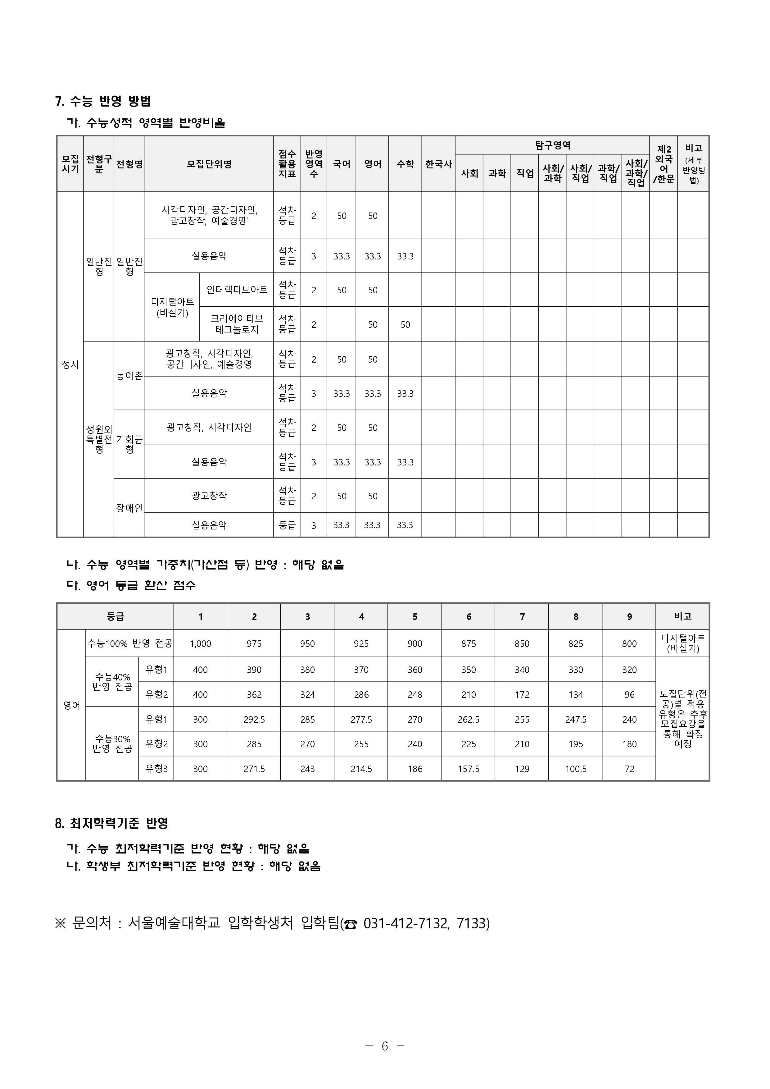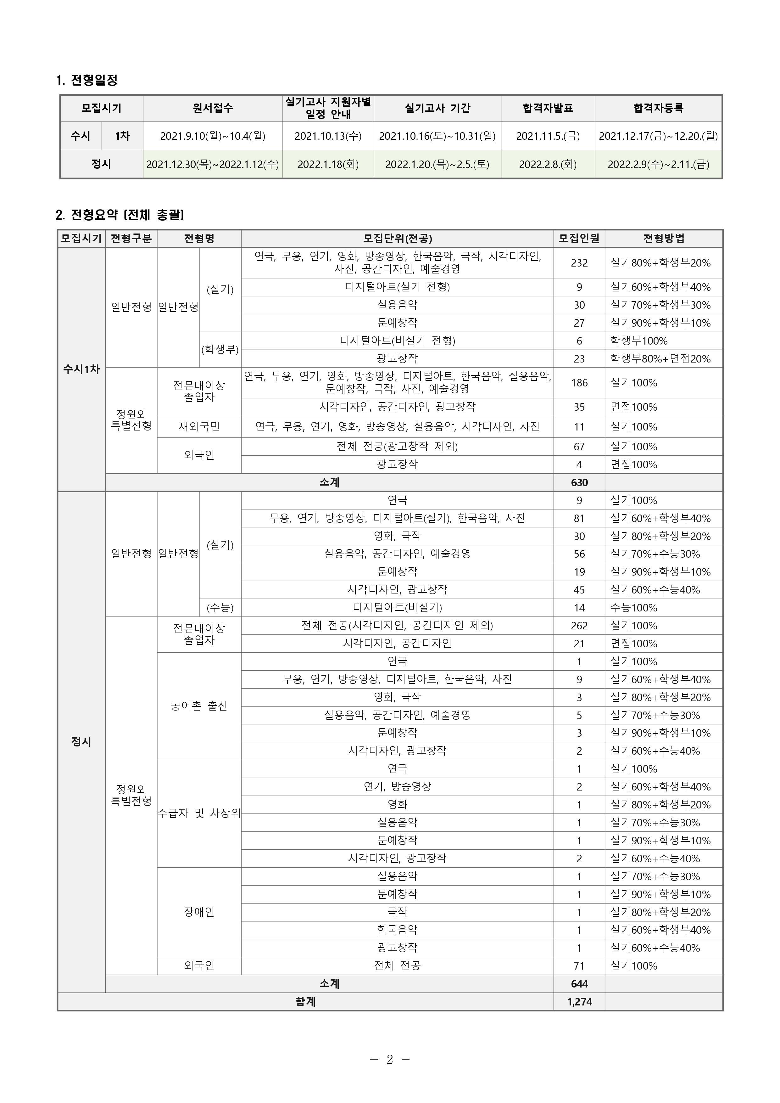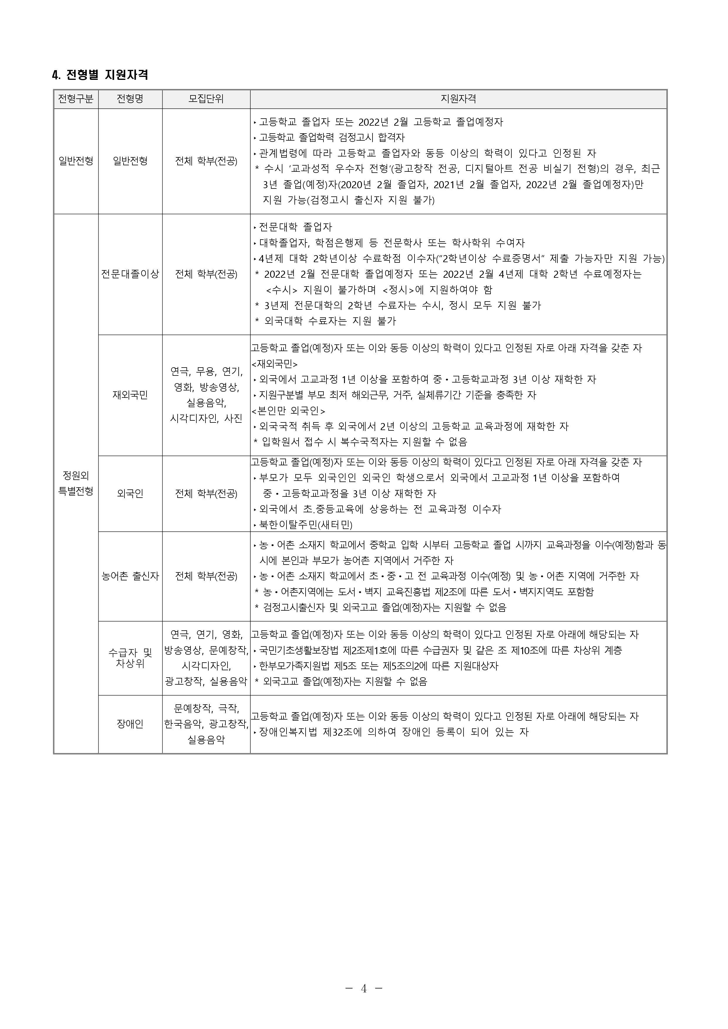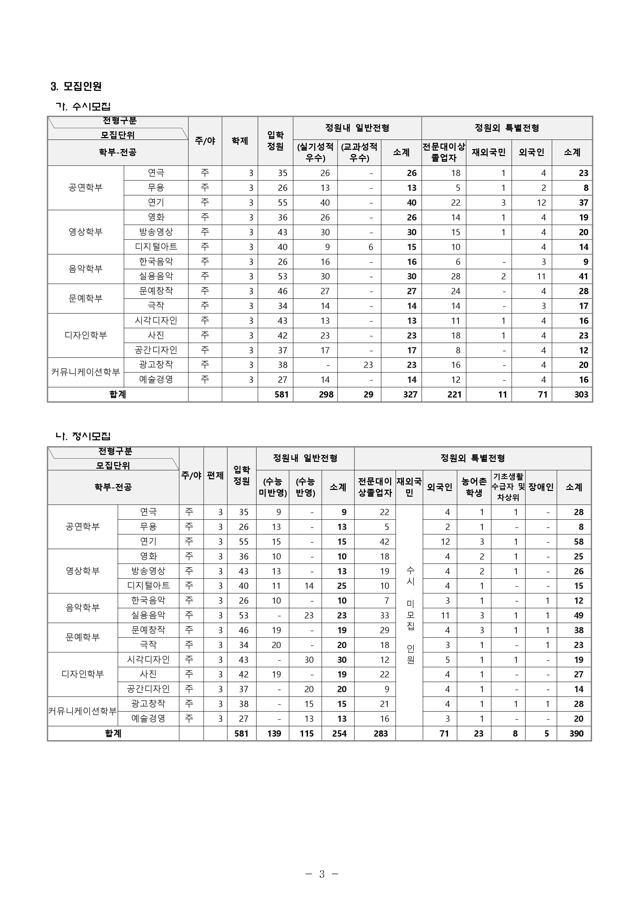 2022학년도 서울예술대학교 입학전형 시행계획 작성자꽃진자리|작성시간21.02.22|조회수4,246 목록 댓글 1 글자크기 작게가 글자크기 크게가 다음검색 현재 게시글 추가 기능 열기 북마크 공유하기 신고 센터로 신고 댓글 댓글 1 댓글쓰기 답글쓰기 댓글 리스트 작성자꽃진자리 작성자 본인 여부 작성자 | 작성시간 21.02.22 서울예대 문창과 희망하시는 학생분들은 참고해주세요. 수업시간에 좀 더 자세히 설명드리겠습니다. 댓글 전체보기