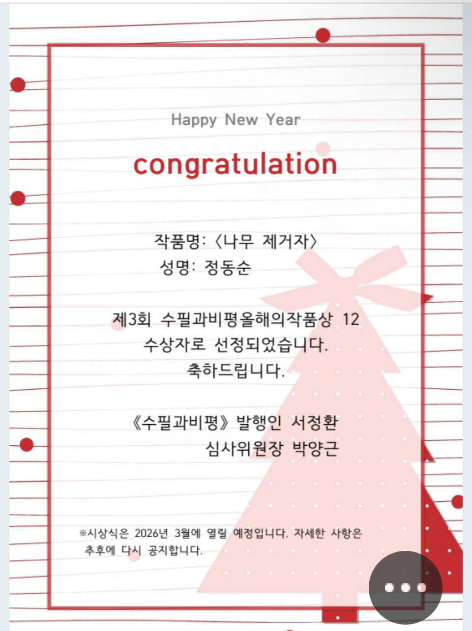 수필분과 정동순 선생님, 제3회 수필과비평올해의 작품상 12 수상자 선정 작성자박보라|작성시간26.01.11|조회수14 목록 댓글 1 글자크기 작게가 글자크기 크게가 다음검색 현재 게시글 추가 기능 열기 북마크 공유하기 신고 센터로 신고 댓글 댓글 1 댓글쓰기 답글쓰기 댓글 리스트 작성자박보라 작성자 본인 여부 작성자 | 작성시간 26.01.11 정동순 선생님, 축하드립니다~~! 댓글 전체보기