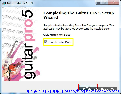 11. Launch Guital Pro 5 (지금 기타프로5 를 실행)을 체크하시고 끝내기(Finish) 누르시면