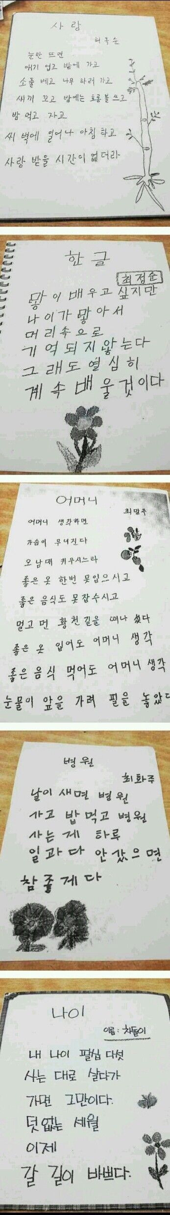 한글을 처음 배운 할머니들의 시 작성자제이|작성시간13.02.14|조회수73 목록 댓글 0 글자크기 작게가 글자크기 크게가 늙으신 나이에 이런 멋지고 잼있는 시를 쓰신 할머니들의 솜씨...정말 대단하시네요^^배움이란 역시 무제한인듯 싶습니다~~ 역시 뭐든지 배우면 좋아요 훈훈합니다. 다음검색 현재 게시글 추가 기능 열기 북마크 공유하기 신고 센터로 신고 댓글 댓글 0 댓글쓰기 답글쓰기 댓글 리스트