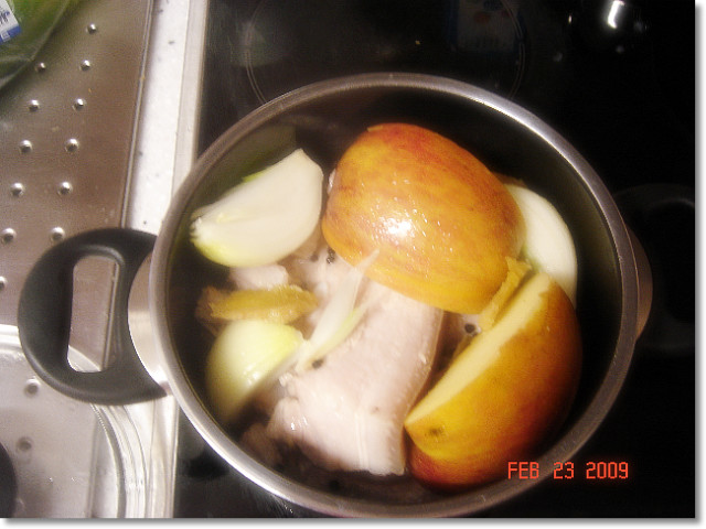 얼리지 않은 삼겹살 두 근에 사과 반 쪽, 양파 1 개, 통후추 30 알 정도, 생강 편 5 쪽 정도, 마늘 10 쪽,