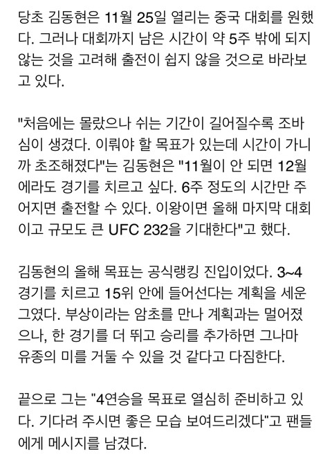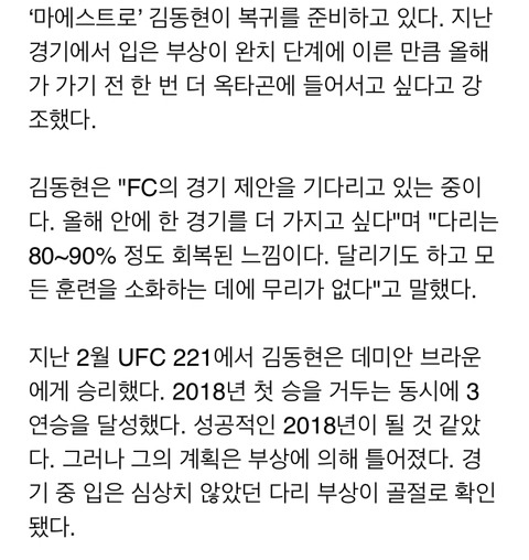 [해외뉴스]‘마에스트로’ 김동현.. “부상 90% 완치, 12월 출전 원한다” 작성자지골로락커|작성시간18.10.17|조회수18 목록 댓글 0 글자크기 작게가 글자크기 크게가 출처 : ufc.com 다음검색 현재 게시글 추가 기능 열기 북마크 공유하기 신고 센터로 신고 댓글 댓글 0 댓글쓰기 답글쓰기 댓글 리스트
