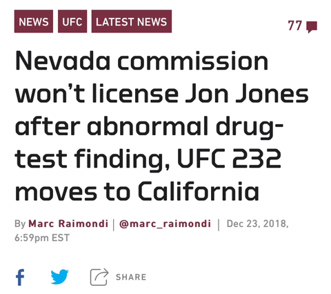https://www.mmafighting.com/2018/12/23/18154375/nevada-commission-wont-license-jon-jones-after-abnormal-drug-test-finding-ufc-232-moves-california