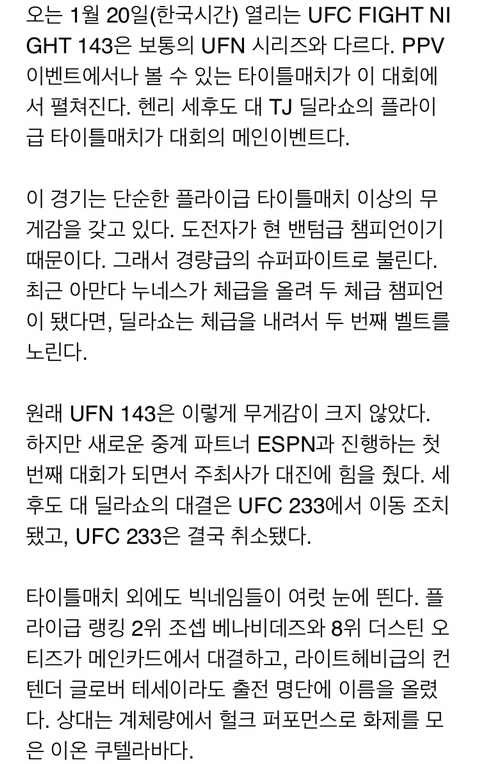 [해외뉴스]세후도 vs 딜라쇼.. 역대급 UFN 대회가 온다 작성자태권도 블루벨트|작성시간19.01.03|조회수113 목록 댓글 3 글자크기 작게가 글자크기 크게가 http://naver.me/FNEMv2cB 다음검색 현재 게시글 추가 기능 열기 북마크 공유하기 신고 센터로 신고 댓글 댓글 3 댓글쓰기 답글쓰기 댓글 리스트 작성자소나섭31 | 작성시간 19.01.03 드존때메 세후도가 플라이급 얼마나 때려잡았었는지 감이 안오지만 암튼 얘는 자기체급 1차방어가 바로 슈퍼파이트네요ㅎ 답댓글 작성자지골로락커 | 작성시간 19.01.03 플라이급도 거의 정리 못했어요 ㅋㅋ전통적인 2인자 조셉 베나비데즈에겐 패배했었고.. 탑컨텐더 중에는 서지오 페티스, 주시에르 포미가 판정으로 잡긴 했네요 ㅎㅎ 작성자menowe | 작성시간 19.01.03 딜라쇼도 두체급 석권? 댓글 전체보기