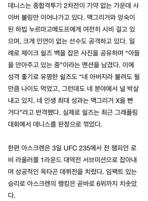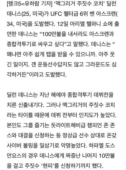[해외뉴스]딜런 데니스.. “돈을 내고라도 아스크렌과 싸우고파.. 아주 쉬운 상대거든” 작성자태권도 블루벨트|작성시간19.03.12|조회수148 목록 댓글 2 글자크기 작게가 글자크기 크게가 http://naver.me/FnLhLkgR 다음검색 현재 게시글 추가 기능 열기 북마크 공유하기 신고 센터로 신고 댓글 댓글 2 댓글쓰기 답글쓰기 댓글 리스트 작성자개코로드리겠음 | 작성시간 19.03.12 끼리끼리 모인다고 하드만... 작성자쏘울라 | 작성시간 19.03.12 ㅋㅋ.. 댓글 전체보기