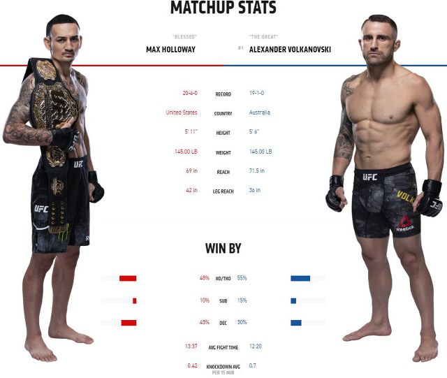 6. 맥스 할로웨이 (1패 후 1승 중) vs 알렉산더 볼카노프스키 (UFC7연승 중) x3