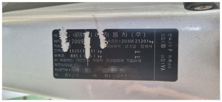 차량의 정보는 2009년식 기아 오피러스