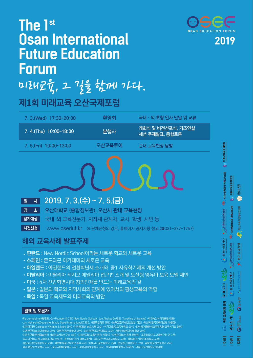 7월 4일 행사 사전접수 시작! 작성자김영학(오산교육재단)|작성시간19.05.27|조회수438 목록 댓글 2 글자크기 작게가 글자크기 크게가 제1회 미래교육 오산 국제포럼 사전 접수가 시작되었습니다!사전접수는 https://www.oseduf.kr/theme/purewhite_wide/apply.php고맙습니다. 다음검색 현재 게시글 추가 기능 열기 북마크 신고 센터로 신고 댓글 댓글 2 댓글쓰기 답글쓰기 댓글 리스트 작성자김미희(광명시) | 작성시간 19.05.27 참석하고 싶은데 시간이 안되네요. 방학때면 좋았을텐데 아쉽.. 작성자김영학(오산교육재단) 작성자 본인 여부 작성자 | 작성시간 19.05.28 전국 시도교육청으로도 공문 발송 예정입니다.출장 달고 참석하실 수 있도록~ 댓글 전체보기