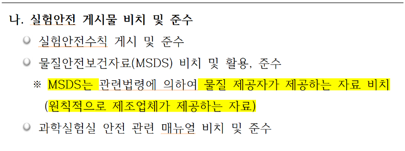답댓글 작성자강성원(경기) 작성자 본인 여부 작성자 작성시간 23.07.25 업체가 시약 공급할 때 함께 MSDS를 의무적으로 제공하는 법적 시스템이 없는건지...